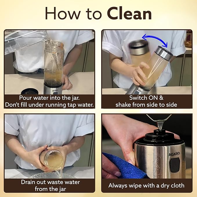 - 🥭 EASY TO USE & CLEAN :- This juice blender is easy to operate with just one button. Tap the switch twice to turn on the device. While working, shake the bottle at 45 degrees to better mix it. The one-time stirring time is 30 seconds. The juicer cup can be opened up and down. Open the lid to drink, open the bottom to clean